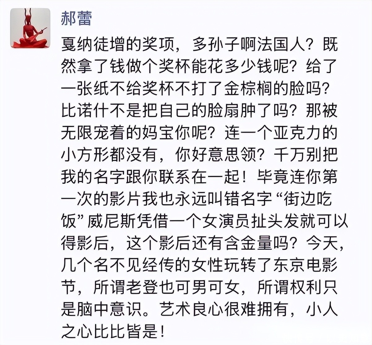2. 几乎在同一时间,远在意大利的辛芷蕾也未能幸免于争议浪潮。一张疑似郝蕾朋友圈截图悄然流传,其中写道:“扯头发就能拿影后?这奖还值得尊重吗?”言语间满是质疑与不屑。